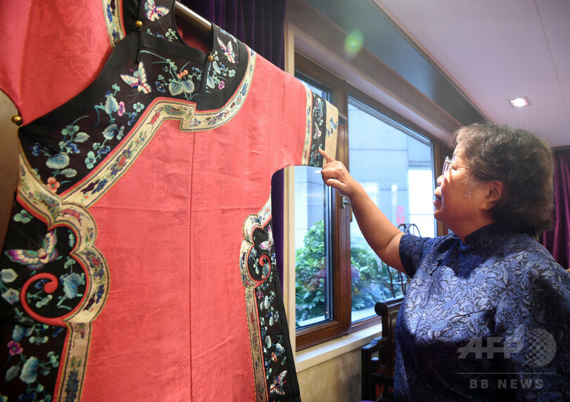 畢紅さんは20数年来、約千点の宮廷や典礼、祭祀などに使われる古典衣装や刺しゅう作品を収集。2013年からは、中国の伝統的衣装からインスピレーションを得て、現代のファッションデザインの中に取り入れ、古今を融合させた特徴あるファッションを創り出しているという。(c)CNS/JCM/AFPBB News