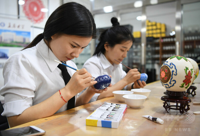 長春大学特殊教育学院の視覚伝達デザイン学科の学生で、みな聴覚障害者だという。学生らは、厚さ数ミリしかない卵の殻の上に美しい世界を刻んでいた。(c)CNS/JCM/AFPBB News