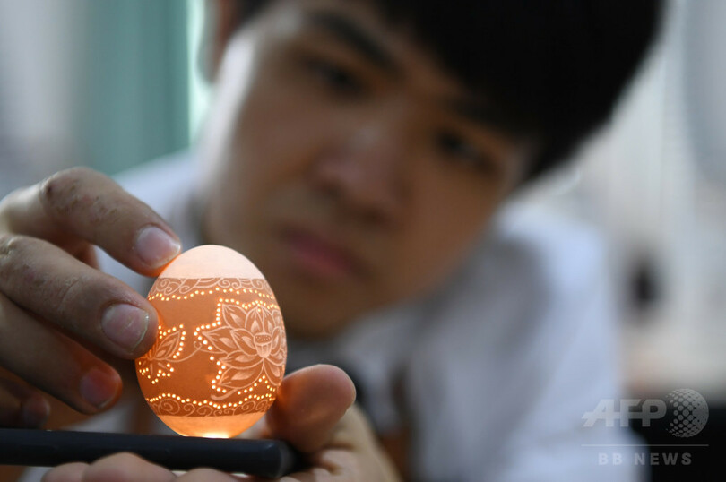長春大学特殊教育学院の視覚伝達デザイン学科の学生で、みな聴覚障害者だという。学生らは、厚さ数ミリしかない卵の殻の上に美しい世界を刻んでいた。(c)CNS/JCM/AFPBB News