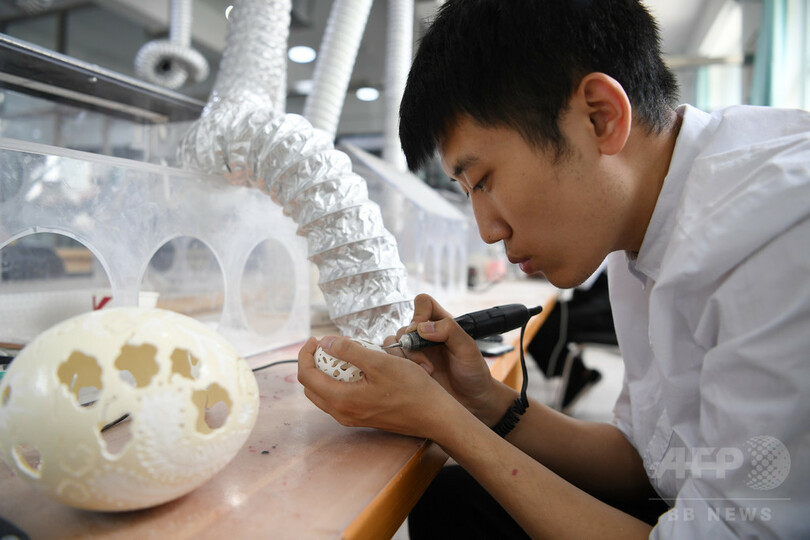 長春大学特殊教育学院の視覚伝達デザイン学科の学生で、みな聴覚障害者だという。学生らは、厚さ数ミリしかない卵の殻の上に美しい世界を刻んでいた。(c)CNS/JCM/AFPBB News
