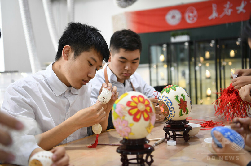 長春大学特殊教育学院の視覚伝達デザイン学科の学生で、みな聴覚障害者だという。学生らは、厚さ数ミリしかない卵の殻の上に美しい世界を刻んでいた。(c)CNS/JCM/AFPBB News
