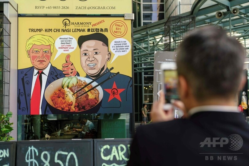 12日に予定される米国のドナルド・トランプ(Donald Trump)大統領と北朝鮮の金正恩(キム・ジョンウン、Kim Jong Un)朝鮮労働党委員長の会談を前に、シンガポールでは多くの飲食店などが会談に便乗し、新メニューを提供している。