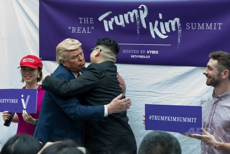 【6月9日 AFP】12日に予定される米国のドナルド・トランプ(Donald Trump)大統領と北朝鮮の金正恩(キム・ジョンウン、Kim Jong Un)朝鮮労働党委員長の歴史的な米朝首脳会談で厳重な警備が予想されるシンガポールで9日、両首脳のそっくりさんが一足先に「会談」した。