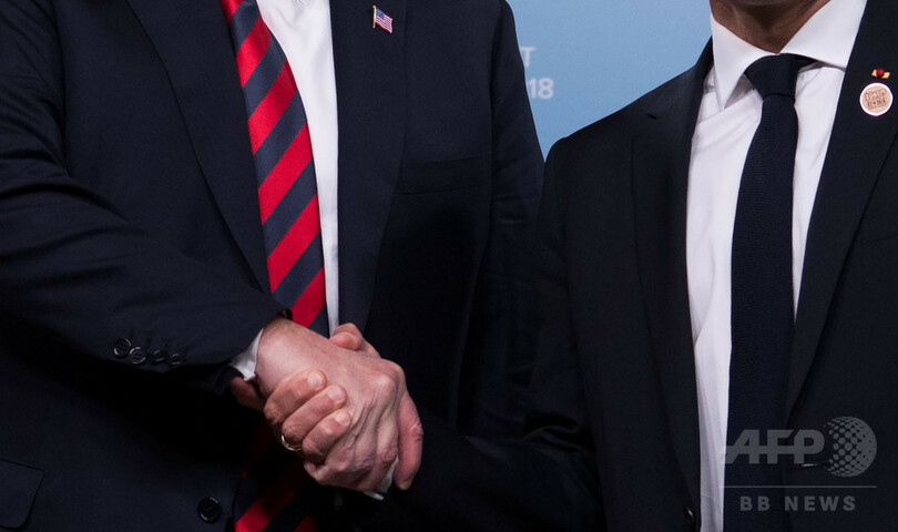 トランプ大統領とマクロン大統領は昨年の初顔合わせ以来、会談のたびに「握手対決」をしている。昨年7月のフランスの革命記念日(Bastille Day)の式典では、まるで互いに相手の手を離したくないとでもいうように25秒間、がっちりと握手を続けた。さらに、その翌日に行われた会談後の別れのあいさつでも、両首脳はまた握手を交わした。この時の握手は30秒近く続き、序盤ではトランプ大統領が優勢だったようで、引き寄せられたマクロン大統領がバランスを崩す場面もあった。トランプ大統領は、マクロン大統領夫人のブリジット(Brigitte Trogneux)さんに別れのキスをするときもマクロン大統領の手を離さなかったという。(c)AFP
