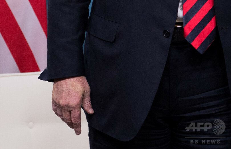 固い友情の印?トランプ米大統領の手にマクロン仏大統領の指痕