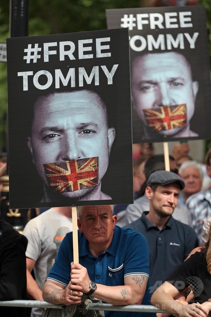 【6月10日 AFP】英ロンドンで9日、極右団体「英防衛同盟(English Defence League)」の元代表、トミー・ロビンソン(Tommy Robinson)氏(本名スティーブン・ヤクスリー・レノン、Stephen Yaxley-Lennon)が法廷侮辱罪などで禁錮刑判決を受けたことに抗議する数百人規模のデモ隊が警察と衝突し、5人が身柄を拘束された。