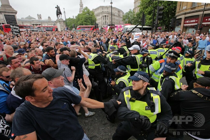 英ロンドンで極右活動家の釈放求め数百人デモ、警官隊と衝突