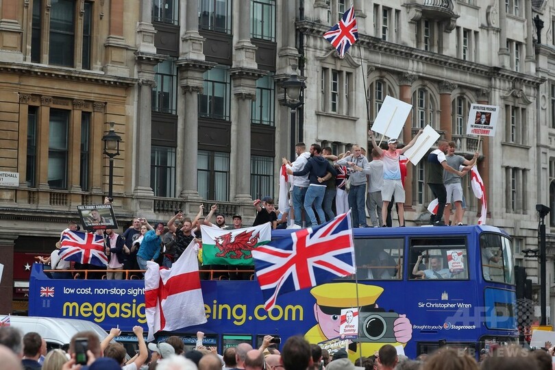 英ロンドンで極右活動家の釈放求め数百人デモ、警官隊と衝突