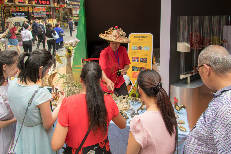 「シュロの葉細工」は、シュロの葉を編んで竜や鶴などさまざまな動物を作る民間工芸で、1700年以上の歴史がある。2011年に国家級無形文化遺産に登録されている。(c)CNS/JCM/AFPBB News