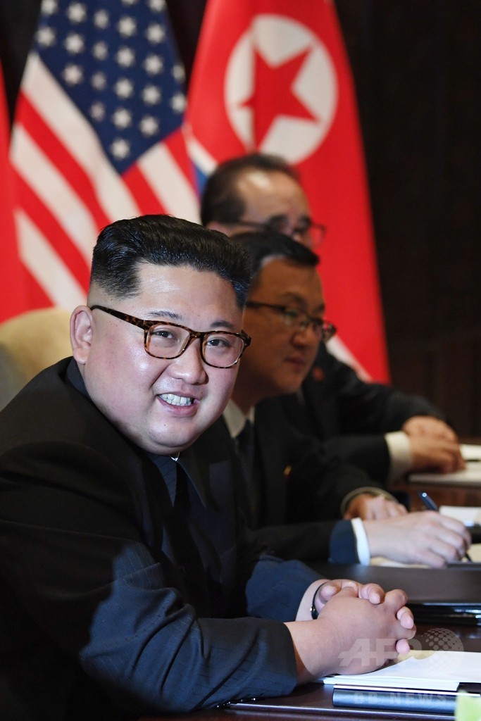 【6月12日 AFP】ドナルド・トランプ(Donald Trump)米大統領と北朝鮮の金正恩(キム・ジョンウン、Kim Jong-Un)朝鮮労働党委員長による史上初の米朝首脳会談は12日午前、通訳を交えただけの一対一の会談が終了し、側近を交えた拡大会合が始まった。(c)AFP