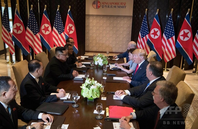 【6月12日 AFP】ドナルド・トランプ(Donald Trump)米大統領と北朝鮮の金正恩(キム・ジョンウン、Kim Jong-Un)朝鮮労働党委員長による史上初の米朝首脳会談は12日午前、通訳を交えただけの一対一の会談が終了し、側近を交えた拡大会合が始まった。(c)AFP