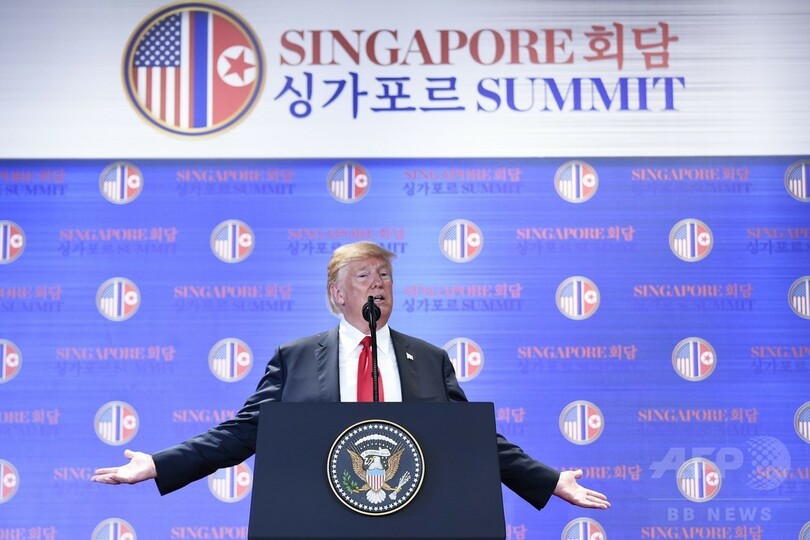 【6月12日 AFP】(更新、写真追加)シンガポールで北朝鮮の金正恩(キム・ジョンウン、Kim Jong-Un)朝鮮労働党委員長と歴史的な会談に臨んだドナルド・トランプ(Donald Trump)米大統領は12日、記者会見を行い、朝鮮戦争(Korean War)は近く終結するとの期待を示した。