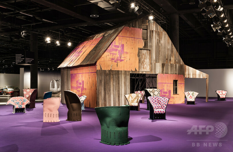 今回のインスタレーションでは、広い空間が一戸建ての納屋で区切られ、“フェルトリ”の限定版アームチェアが一面に置かれている。1番から50番のアームチェアは会場で購入が可能で、残りの51番から100番は、「カッシーナ」を通じて後日購入できる。納屋は「カルバン・クライン」18年秋のランウェイショー用に作られたものの一つで、19世紀の再生材を使って再現されている。2020年まで締結されたアンディ・ウォーホル美術財団とのパートナーシップの一環として、壁紙にはアンディ・ウォーホル作品があしらわれた。