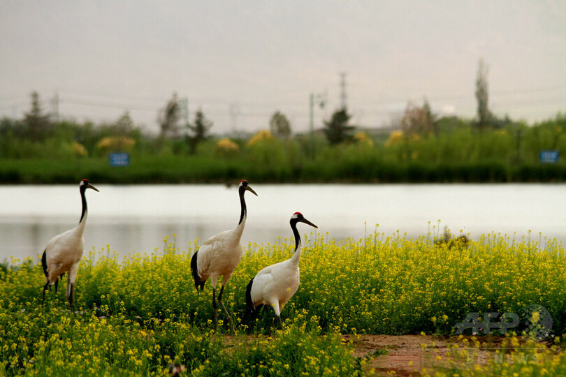 タンチョウが菜の花畑に飛来 甘粛省