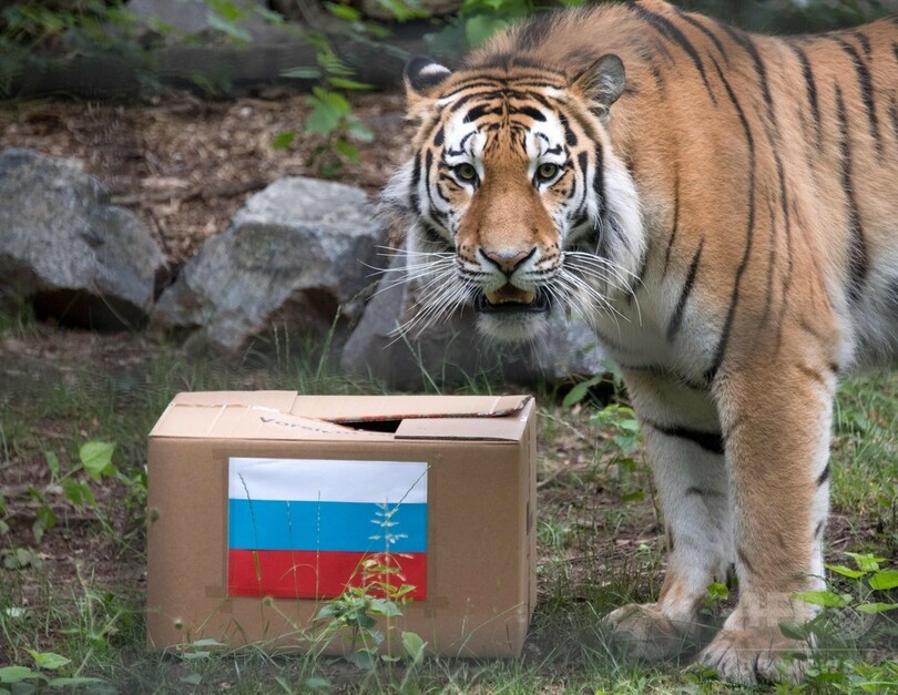 また同日には、ドイツ東部ケムニッツ(Chemnitz)にある動物園で、アムールトラの「ボロージャ」が同じくW杯開幕戦の結果を予想し、こちらは引き分けとなった。(c)AFP
