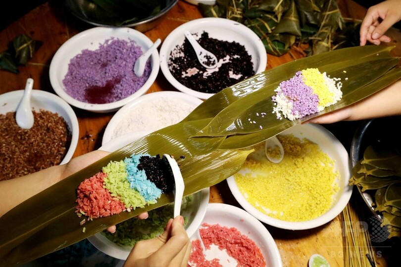 【6月17日 CNS】中国・広西チワン族自治区(Guangxi Zhuang Autonomous Region)柳州市(Liuzhou)融安県(Rongan)雅瑶郷(Yayao)の西古坡(Xigupo)集落で、村民と観光客が一緒に現地独特のちまき作りに挑戦し、中国伝統の端午節を祝った。