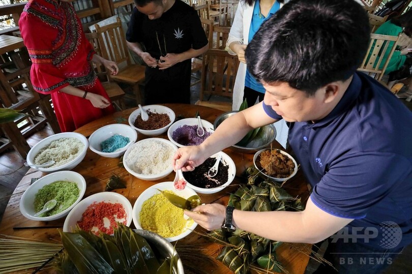 五色の食材で作られた色鮮やかな見た目と、香り豊かな柔かい食感が観光客に人気で、貧困脱出のための新たな収入源にもなっている。(c)CNS/JCM/AFPBB News