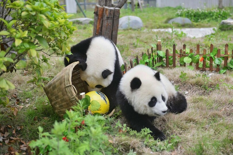 【6月17日 AFP】中国南西部四川(Sichuan)省ブン川(Wenchuan)県の中国ジャイアントパンダ保護研究センター(China Conservation and Research Center for the Giant Panda)で、サッカーW杯ロシア大会(2018 World Cup)に合わせ、パンダたちがサッカーボールや籠で遊ぶ姿が見られた。(c)AFP