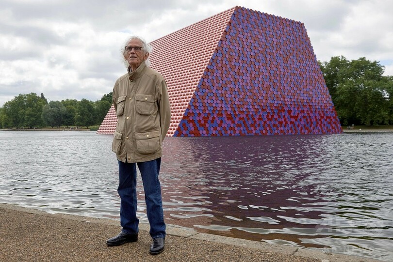 アート作品「The London Mastaba(ロンドン・マスタバ、マスタバは墳墓の意)」は、ロンドンのハイド・パーク(Hyde Park)内にあるサーペンタイン・レイク(Serpentine lake)の水面に、600トン分のドラム缶7506個を台形に積み上げている。式には米在住の神秘的な雰囲気をまとったクリスト氏が出席し、作品をお披露目した。