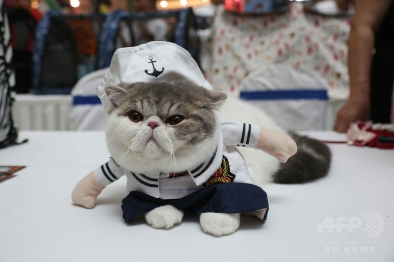 ドレスアップした猫たちが、人間のモデルと一緒にランウェイを歩いていた。(c)CNS/JCM/AFPBB News