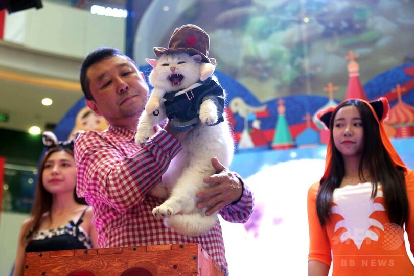ドレスアップした猫たちが、人間のモデルと一緒にランウェイを歩いていた。(c)CNS/JCM/AFPBB News