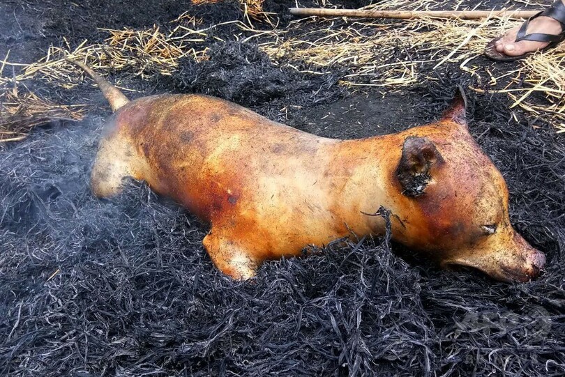中には犬の丸焼きを並べて販売している露店もあった。ただ地元住民の話では、丸焼きの販売は例年に比べると減ったという。(c)AFP/Pak YIU