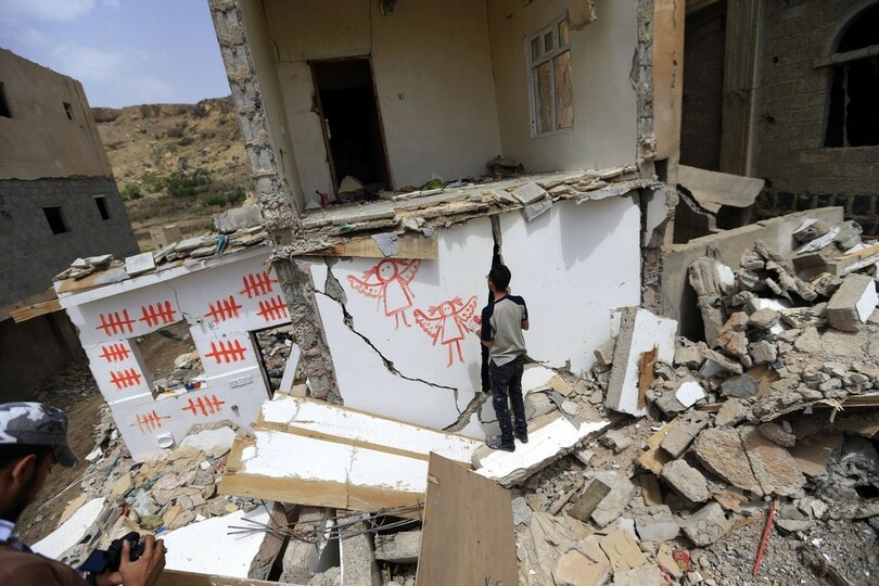 空爆で廃虚となった建物に描くグラフィティ、イエメン