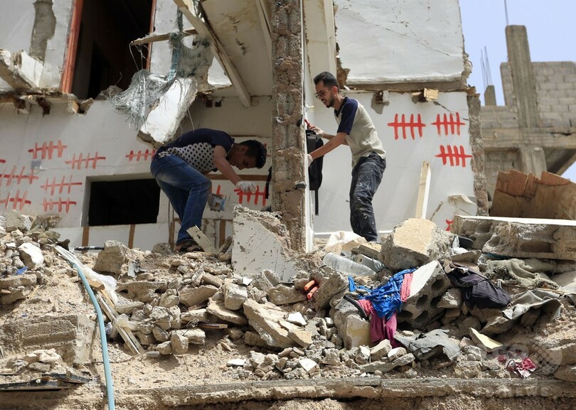 【6月26日 AFP】イエメンの首都サヌアで、「シュラプネル(りゅう散弾)」と呼ばれる活動の一環として、空爆により破壊された建物にグラフィティを描くディ・イエザン・アラウィ(Dhi Yezan al-Alawi)さんらアーティスト。サウジアラビア主導の連合軍は2015年3月、アブドラボ・マンスール・ハディ(Abedrabbo Mansour Hadi)暫定大統領の復権を最終目的とする軍事行動を開始した。これまでに1万人近くが犠牲となったが、その多くが民間人だ。(c)AFP