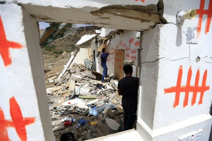 【6月26日 AFP】イエメンの首都サヌアで、「シュラプネル(りゅう散弾)」と呼ばれる活動の一環として、空爆により破壊された建物にグラフィティを描くディ・イエザン・アラウィ(Dhi Yezan al-Alawi)さんらアーティスト。サウジアラビア主導の連合軍は2015年3月、アブドラボ・マンスール・ハディ(Abedrabbo Mansour Hadi)暫定大統領の復権を最終目的とする軍事行動を開始した。これまでに1万人近くが犠牲となったが、その多くが民間人だ。(c)AFP