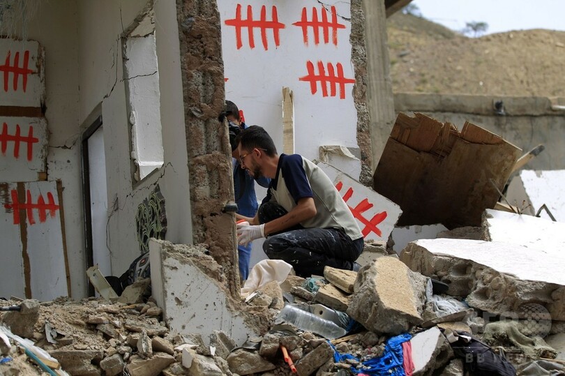 【6月26日 AFP】イエメンの首都サヌアで、「シュラプネル(りゅう散弾)」と呼ばれる活動の一環として、空爆により破壊された建物にグラフィティを描くディ・イエザン・アラウィ(Dhi Yezan al-Alawi)さんらアーティスト。サウジアラビア主導の連合軍は2015年3月、アブドラボ・マンスール・ハディ(Abedrabbo Mansour Hadi)暫定大統領の復権を最終目的とする軍事行動を開始した。これまでに1万人近くが犠牲となったが、その多くが民間人だ。(c)AFP