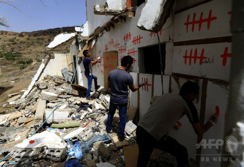 【6月26日 AFP】イエメンの首都サヌアで、「シュラプネル(りゅう散弾)」と呼ばれる活動の一環として、空爆により破壊された建物にグラフィティを描くディ・イエザン・アラウィ(Dhi Yezan al-Alawi)さんらアーティスト。サウジアラビア主導の連合軍は2015年3月、アブドラボ・マンスール・ハディ(Abedrabbo Mansour Hadi)暫定大統領の復権を最終目的とする軍事行動を開始した。これまでに1万人近くが犠牲となったが、その多くが民間人だ。(c)AFP