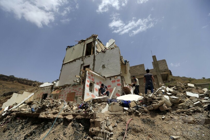 【6月26日 AFP】イエメンの首都サヌアで、「シュラプネル(りゅう散弾)」と呼ばれる活動の一環として、空爆により破壊された建物にグラフィティを描くディ・イエザン・アラウィ(Dhi Yezan al-Alawi)さんらアーティスト。サウジアラビア主導の連合軍は2015年3月、アブドラボ・マンスール・ハディ(Abedrabbo Mansour Hadi)暫定大統領の復権を最終目的とする軍事行動を開始した。これまでに1万人近くが犠牲となったが、その多くが民間人だ。(c)AFP