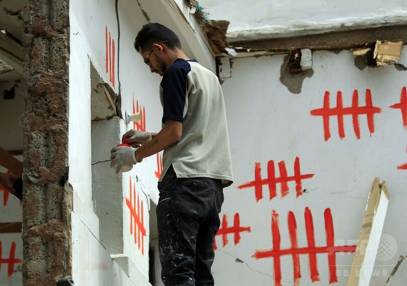 【6月26日 AFP】イエメンの首都サヌアで、「シュラプネル(りゅう散弾)」と呼ばれる活動の一環として、空爆により破壊された建物にグラフィティを描くディ・イエザン・アラウィ(Dhi Yezan al-Alawi)さんらアーティスト。サウジアラビア主導の連合軍は2015年3月、アブドラボ・マンスール・ハディ(Abedrabbo Mansour Hadi)暫定大統領の復権を最終目的とする軍事行動を開始した。これまでに1万人近くが犠牲となったが、その多くが民間人だ。(c)AFP