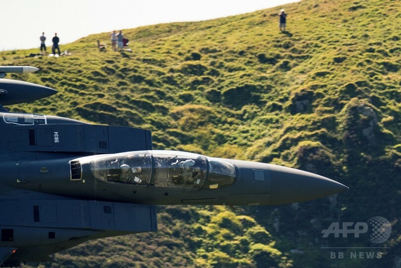 地上すれすれ超低空飛行のF15戦闘機、英ウェールズ