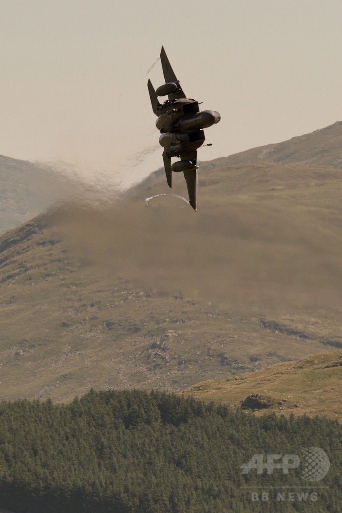 【6月27日 AFP】英ウェールズ北部ドルゲライ(Dolgellau)近くの「マック・ループ(Mach Loop)」で26日、米空軍による低空飛行訓練が行われ、集まったファンは峡谷を飛ぶF15戦闘機を見守った。マック・ループはドルゲライとマハンスレス(Machynlleth)の間にある谷で、低空飛行訓練が定期的に行われている。訓練では、地上76メートルまで高度を下げることもある。(c)AFP