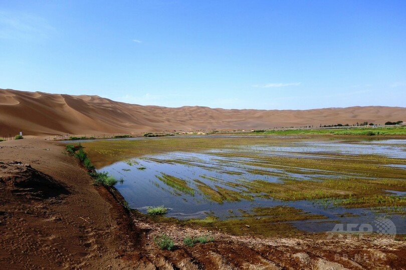 【6月29日 CNS】新疆ウイグル自治区(Xinjiang Uighur Autonomous Region)トルファン(Turpan)庫木塔格(クムタグ、Kumtag)砂漠の辺縁部にある鄯善県(Shanshan)辟展郷(Pizhan)小東湖。中国東北地方から導入した新型のわせ品種の水稲が、6月中旬から砂漠の中で青く色づいている。