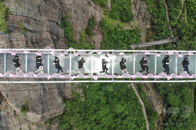 【7月3日 CNS】中国・湖南省(Hunan)長沙市(Changsha)から来た学生20人は、湖南省の南平江(Nanpingjiang)石牛寨(Shiniuzhai)にある透明のガラス橋で、4年間の学生生活の記念として、上空からの卒業写真を撮影した。(c)CNS/JCM/AFPBB News