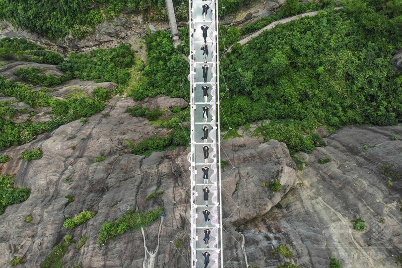 【7月3日 CNS】中国・湖南省(Hunan)長沙市(Changsha)から来た学生20人は、湖南省の南平江(Nanpingjiang)石牛寨(Shiniuzhai)にある透明のガラス橋で、4年間の学生生活の記念として、上空からの卒業写真を撮影した。(c)CNS/JCM/AFPBB News