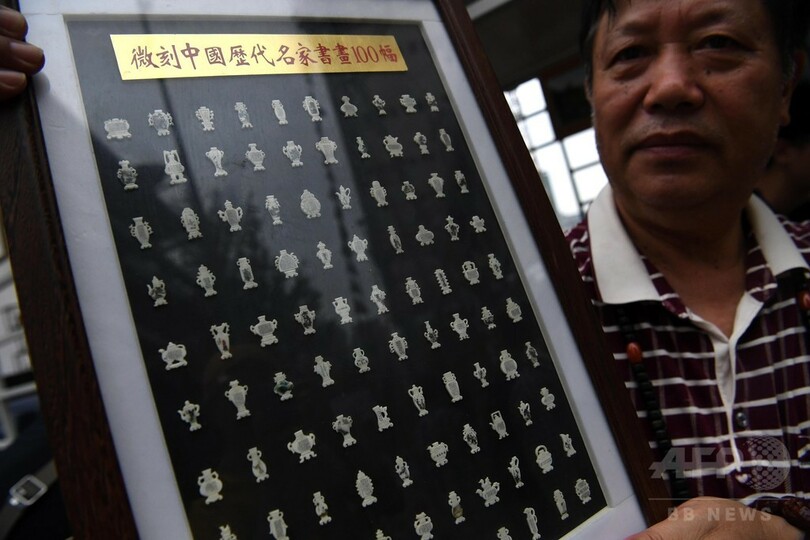 中には、髪の毛よりも細い文字が刻み込まれた彫刻作品があり、虫メガネを使わないと確認できないほどだ。(c)CNS/JCM/AFPBB News