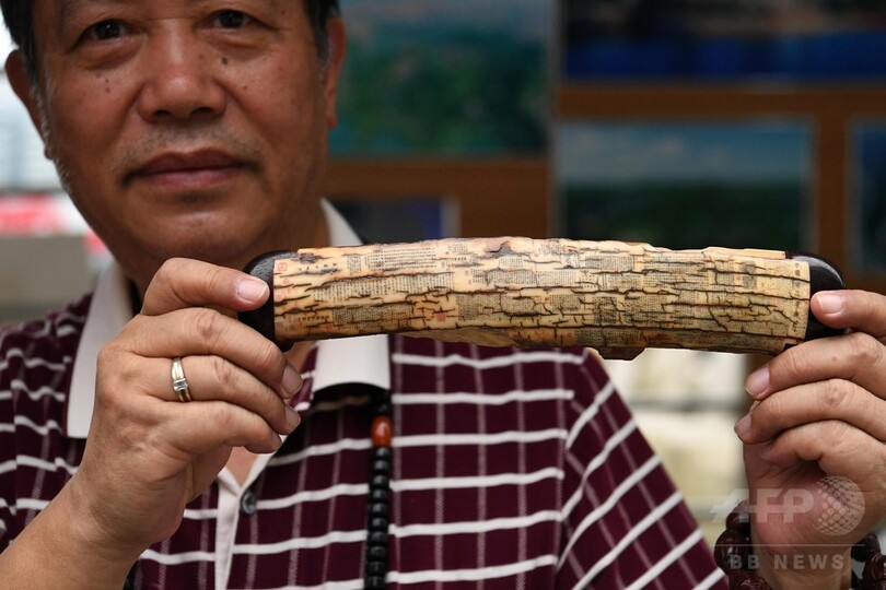 中には、髪の毛よりも細い文字が刻み込まれた彫刻作品があり、虫メガネを使わないと確認できないほどだ。(c)CNS/JCM/AFPBB News