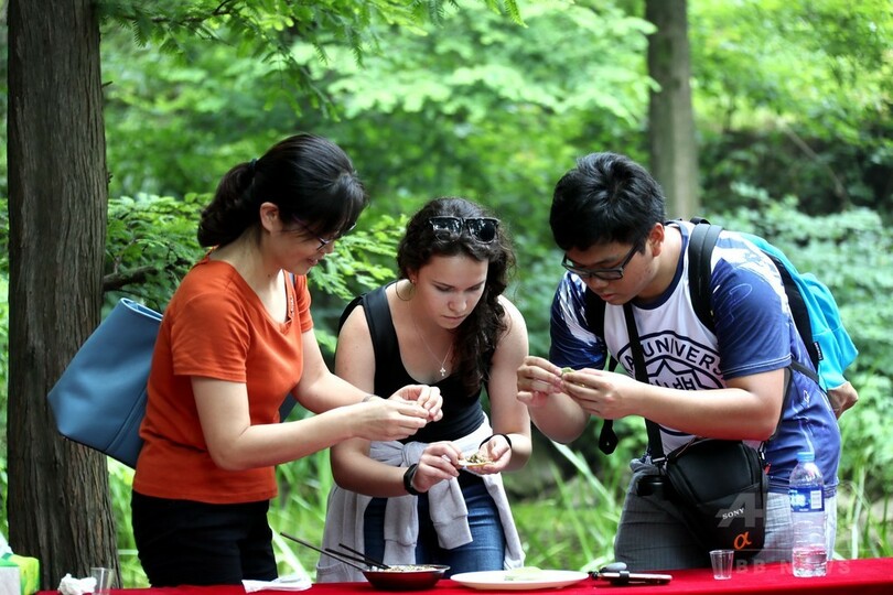 川に設置された桟道で、緑茶の茶葉を加えた毛尖(もうせん)餃子の作り方を地元住民から学び、野外で食事をした。中国の美食文化を堪能した留学生たちは、中国語のことわざを用いて、素晴らしい昼食だったと称賛した。(c)CNS/JCM/AFPBB News