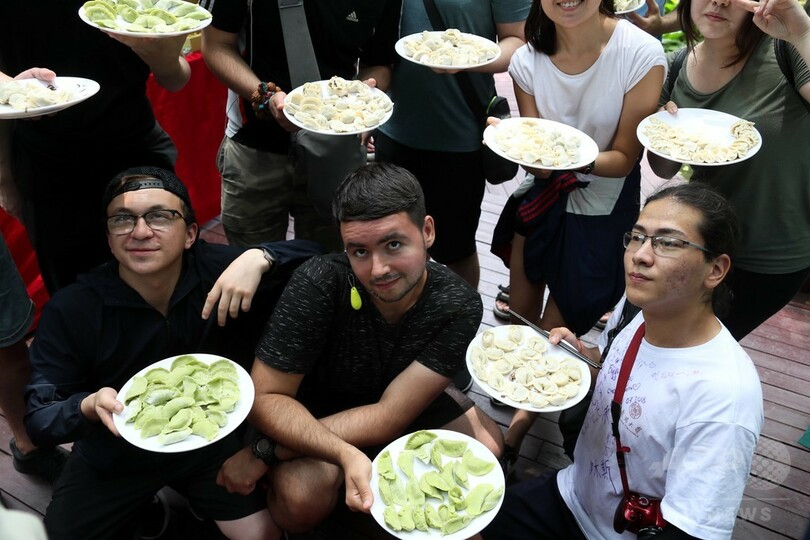 川に設置された桟道で、緑茶の茶葉を加えた毛尖(もうせん)餃子の作り方を地元住民から学び、野外で食事をした。中国の美食文化を堪能した留学生たちは、中国語のことわざを用いて、素晴らしい昼食だったと称賛した。(c)CNS/JCM/AFPBB News