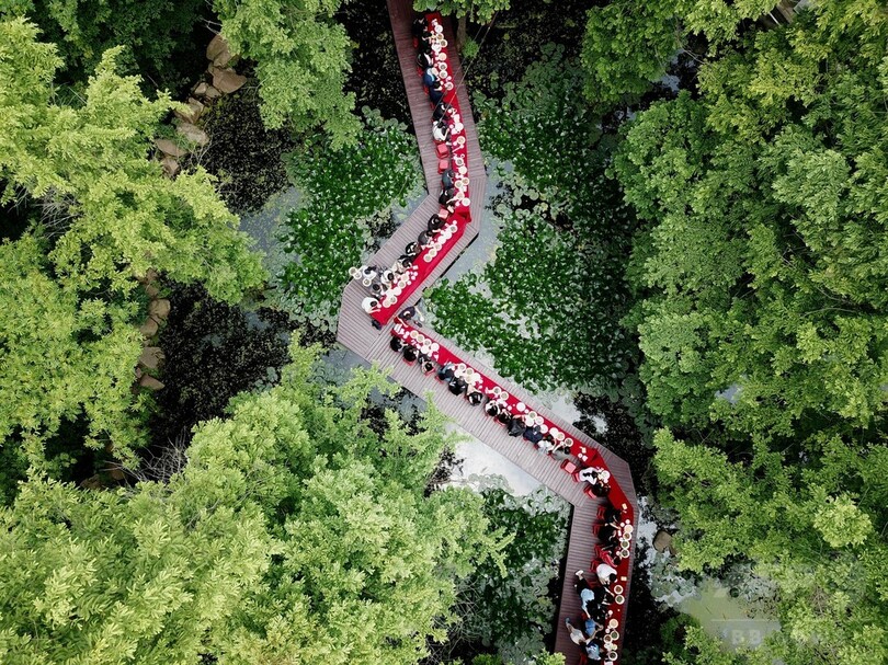 川に設置された桟道で、緑茶の茶葉を加えた毛尖(もうせん)餃子の作り方を地元住民から学び、野外で食事をした。中国の美食文化を堪能した留学生たちは、中国語のことわざを用いて、素晴らしい昼食だったと称賛した。(c)CNS/JCM/AFPBB News
