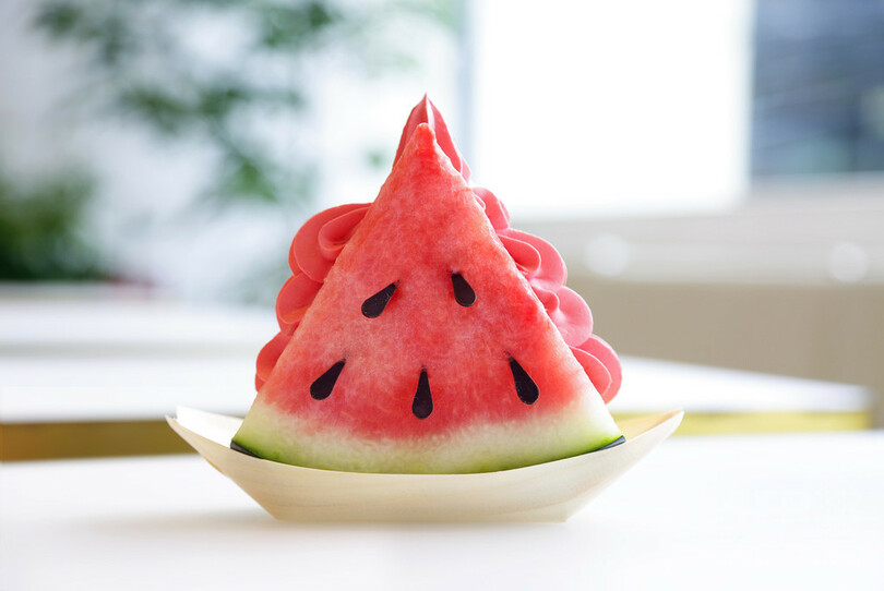 「ウォーターメロン ソフトサーブ」 は、スイカのフレイバーソフトサーブをスイカの果肉で挟み、シャリシャリとした食感と甘さの奥から旨みが湧き出てくる美味しさが特徴的な一品。スイカの種に見立てたチョコレートや、お好みで塩をかけて味の変化を楽しむなど、これからの季節に欠かせないひんやりスイーツ。