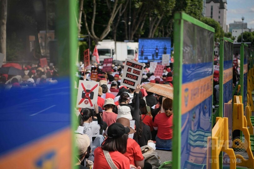 ソウル中心で行われた抗議デモで、女性たちは「盗撮する男たち、ネットに盗撮動画を投稿する男たち、盗撮動画を見る男たち、全員に厳罰を!」と繰り返し声を上げた。「私の生活はあなたたちのポルノじゃない」「あなたたちのいやらしいファンタジーの性的対象物にしないで」などと書かれた横断幕もみられた。