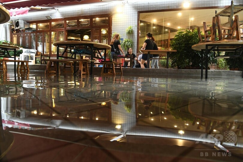 江北区(Jiangbei)洋河路にある火鍋店の程店長は、夏に火鍋を食べるのは大変だろうと思い、店内に水を引いたという。(c)CNS/JCM/AFPBB News