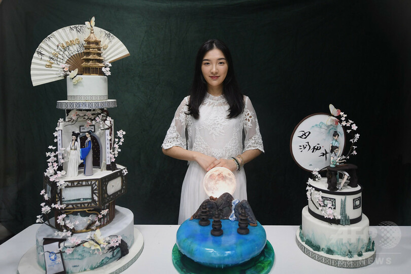 陳さんは浙江省の有名なパティシエだ。陳さんのパートナーである汪彗(Wang Hui)さんと共に、中国古代の伝説上の人物「白娘子(Bai Niang Zi)」や雷峰塔(Leifeng Pagoda)など杭州文化の象徴をフォンダントケーキに彫り、「江南の記憶」を広めている。(c)CNS/JCM/AFPBB News