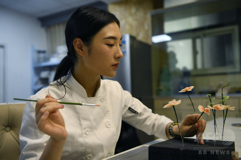 陳さんは浙江省の有名なパティシエだ。陳さんのパートナーである汪彗(Wang Hui)さんと共に、中国古代の伝説上の人物「白娘子(Bai Niang Zi)」や雷峰塔(Leifeng Pagoda)など杭州文化の象徴をフォンダントケーキに彫り、「江南の記憶」を広めている。(c)CNS/JCM/AFPBB News