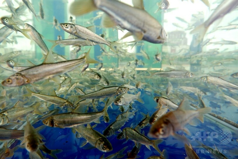 現地のチベット族と観光客が、養殖で育てた100万尾の青海湖裸鯉の稚魚を、青海湖に流れ込む主要河川の沙柳河(Shaliu River)に放流した。(c)CNS/JCM/AFPBB News