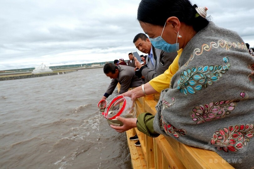 現地のチベット族と観光客が、養殖で育てた100万尾の青海湖裸鯉の稚魚を、青海湖に流れ込む主要河川の沙柳河(Shaliu River)に放流した。(c)CNS/JCM/AFPBB News